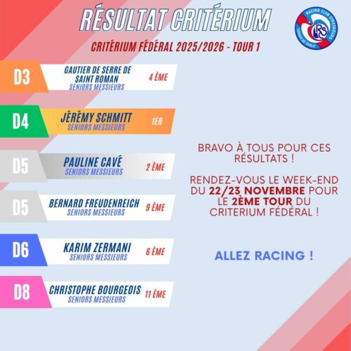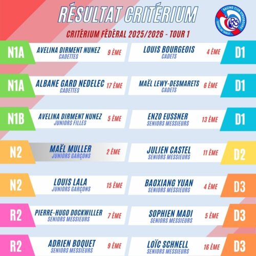 Un 1er tour ou quelques uns des nôtres ont su s’illustrer : en nationale, Avelina Dirment Nunez signe un très beau week-end en N1A cadettes et N1B junior pendant que Maël Muller va chercher une très belle finale en N2 junior. Du côté de la départementale, à noter la belle prestation de notre recrue Pauline Cavé qui fait finale en D5, et la victoire en D3 de Jeremy Schmitt ! Bravo à eux !