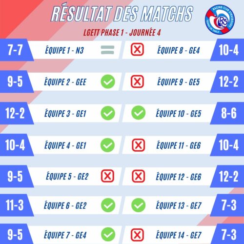 – EQ 4 : Victoire 10-4 pour la 4 qui continue son sans-faute et reste co-leader de la poule avec Barr, qu’elle affrontera en J7.