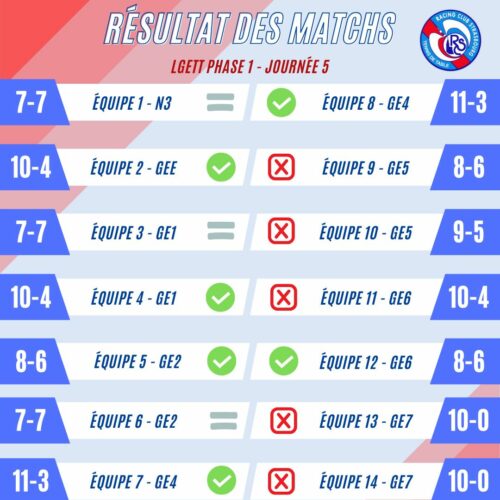 – EQ 5 : Une défaite rageante 8-6 contre un adversaire mieux armé sur le papier pour la 5, avec de nombreux matchs perdus à la belle, dommage !GE1 :
