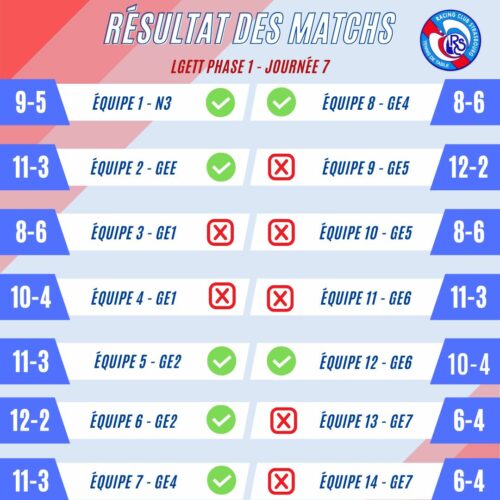 – EQ 7 : Belle victoire 11-3 de l’équipe 7 contre son co-leader, il ne manque qu’un nul en J7 pour s’assurer de monter.GE2 :