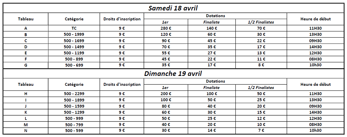 Article 9 : Les inscriptions seront clôturées sur le site HelloAsso le vendredi 17 avril 2026 23h59. Des inscriptions pourront être prises sur place dans la limite des places disponibles jusqu’à 30 minutes avant le début de chaque tableau. Le paiement de l’inscription fait office de confirmation de participation.