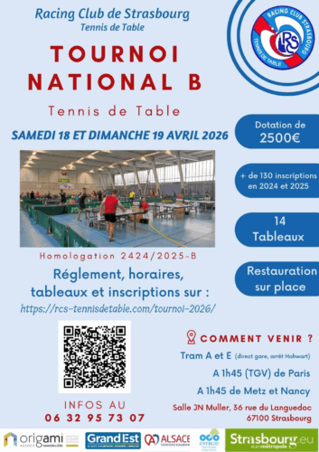 Pour ce tournoi, toutes les inscriptions se feront via le lien : https://www.helloasso.com/associations/rc-strasbourg-tennis-de-table/evenements/tournoi-national-rc-strasbourg-2026